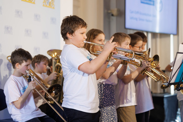 Die Bläserklasse der Grundschule Dießen a. Ammersee bereicherte die Veranstaltung schwungvoll und begleitete auch den Kanon "Ich mag das Singen, ich mag das Musizier`n", den alle Anwesenden gemeinsam sangen - ein "ausgezeichneter" Spontan-Chor!
