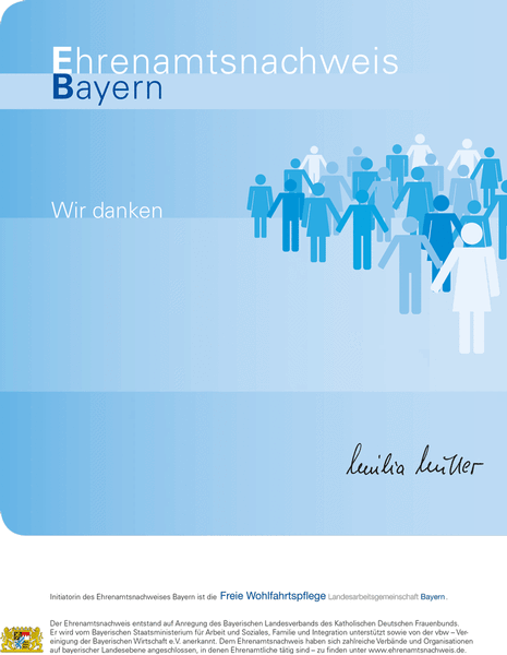 Mit dem Ehrenamtsnachweis Bayern zeichnet der Freistaaat Bayern ehrenamtliches Engagement aus und dokumentiert die mit dem ehrenamtlichen Engagement verbundenen Kompetenzen.
